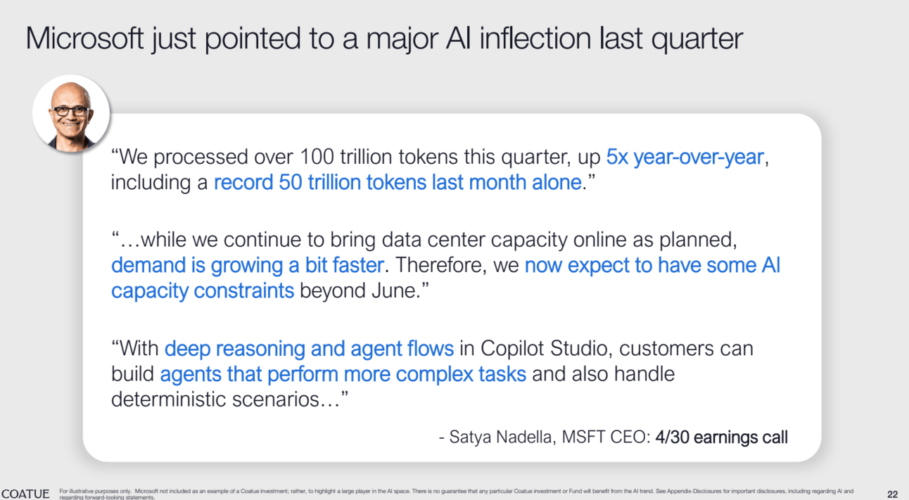 Microsoft processed 100 trillion tokens last quarter. That’s 5x YoY. And they’re warning of a compute shortage. Translation: the wave’s here and it’s only getting bigger.